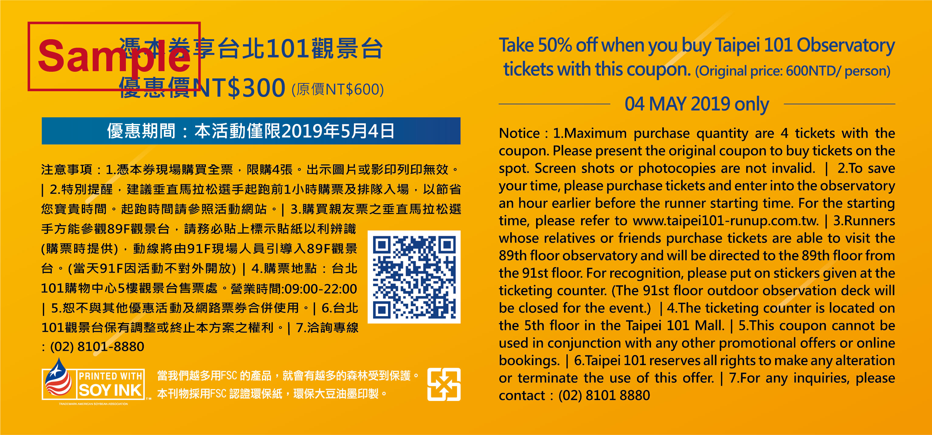 - Present the original coupon enclosed in the race kit to buy observatory ticket and enjoy 50% discount. Terms and conditions please refer to the coupon.