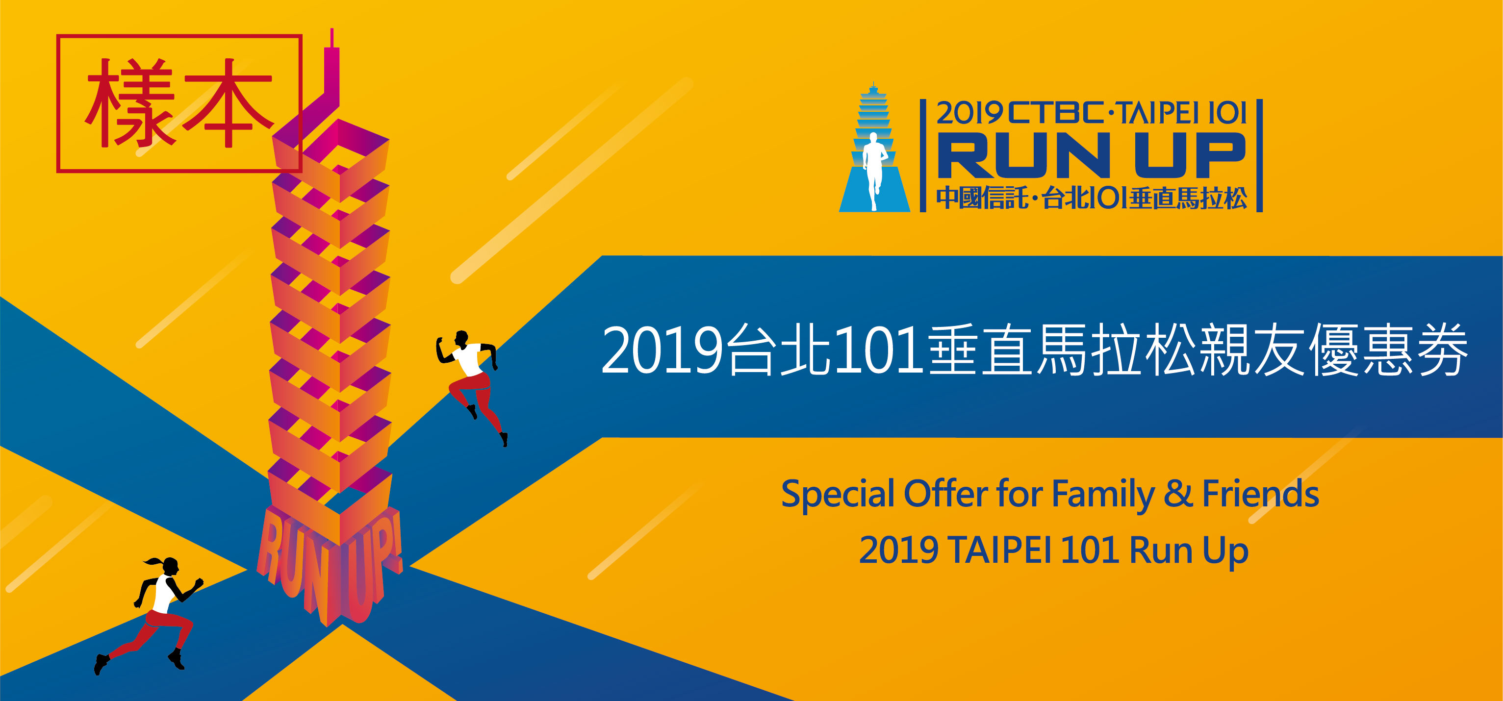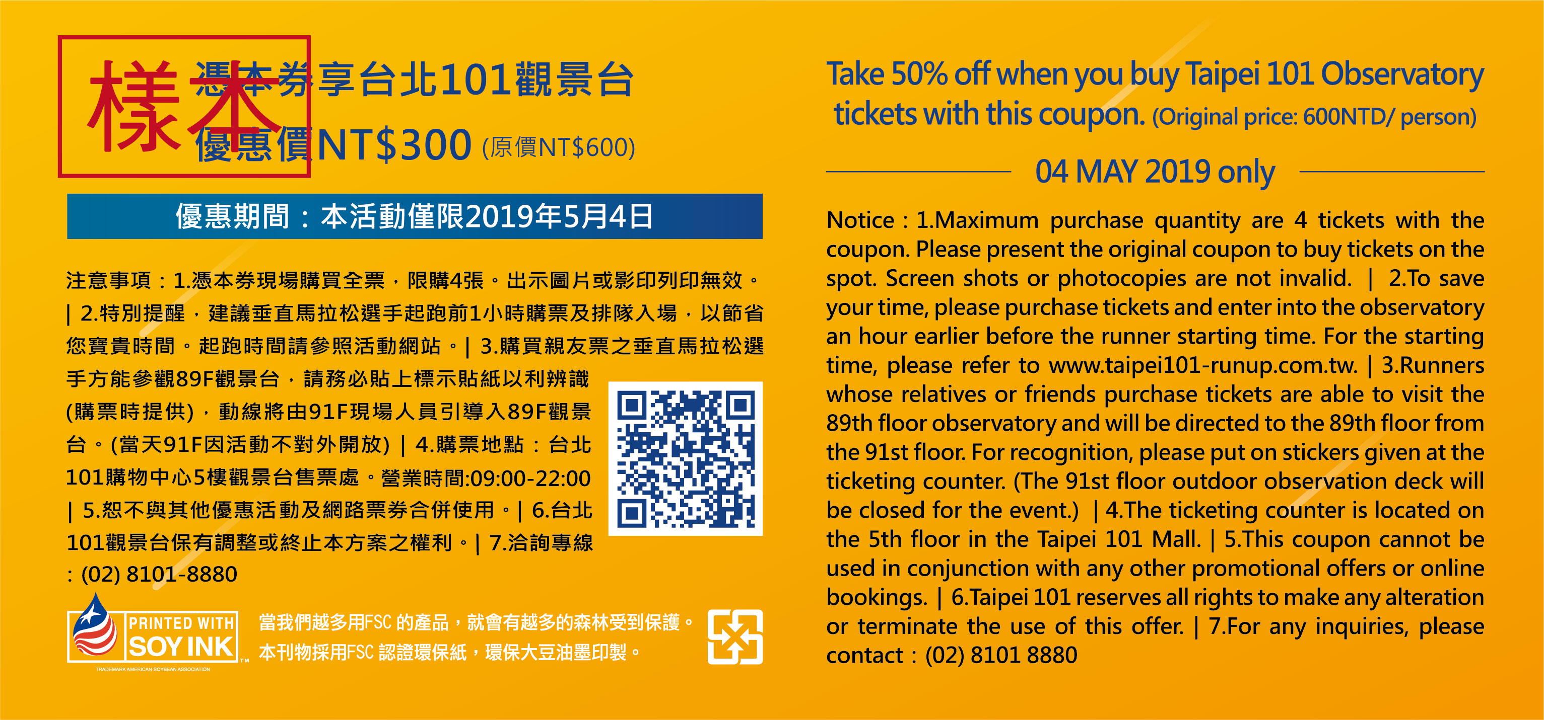 - 請憑物資包內的『2019台北101垂直馬拉松親友優惠券』至5F觀景台售票櫃檯購票。購票注意事項請參照票券上方說明。